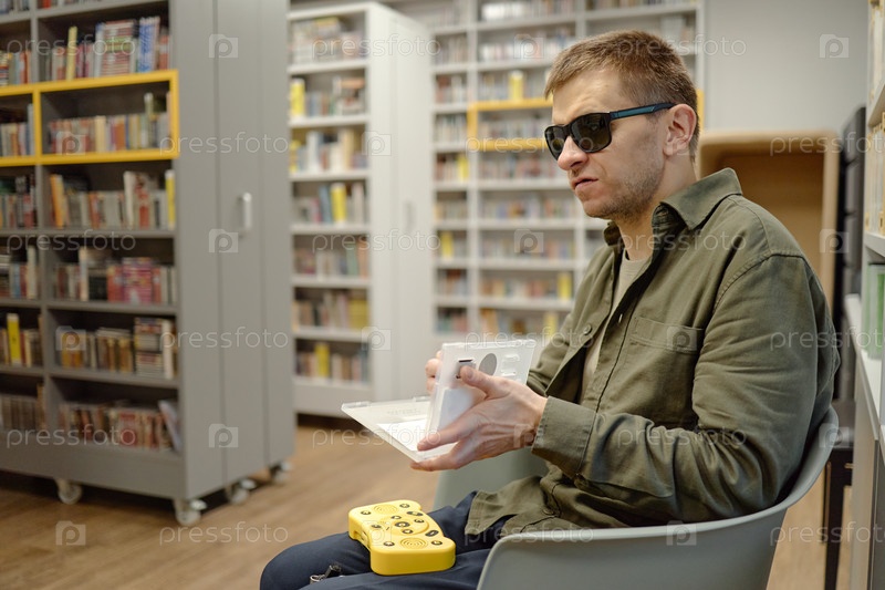 Молодой человек читает книгу Брайля с помощью вспомогательного устройства в библиотеке