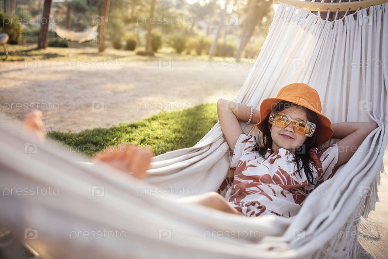 Молодая девушка отдыхает в гамаке, одетая в оранжевую шляпу и солнцезащитные очки, окружена зеленью и солнечным светом в спокойной атмосфере на открытом воздухе