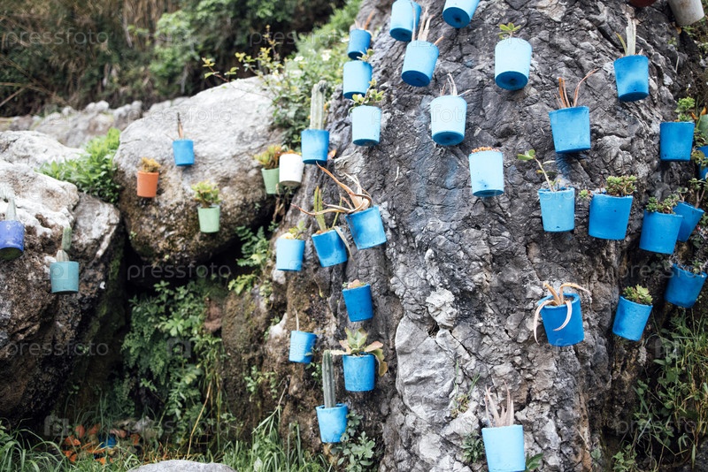 Голубые и зеленые цветочные горшки, установленные на скалистой стене, демонстрируют уникальный вертикальный дизайн сада с различными растениями и естественной зелени в окрестностях