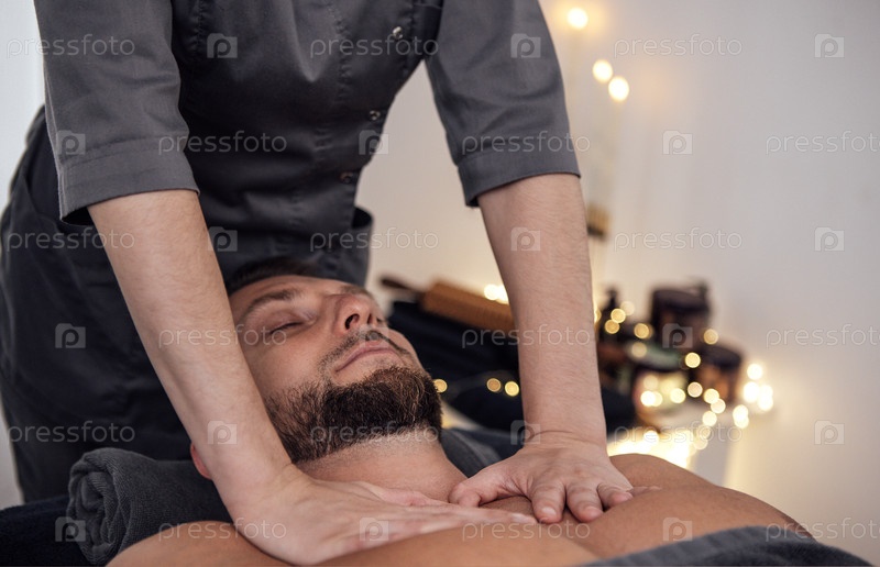 Клиент мужского пола получает расслабляющий массаж от профессионального терапевта в спокойной спа-среде с мягким освещением и успокаивающей атмосферой, способствуя оздоровлению и релаксации