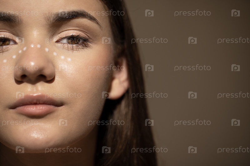 Молодая женщина с натуральным макияжем и декоративными точками на лице, уверенно смотрящая в камеру, демонстрирующая красоту и самовыражение в минималистической обстановке