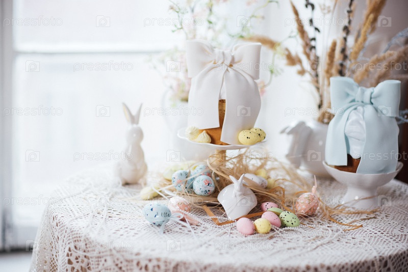 Декоративное пасхальное столовое убранство с двумя тортами, завернутыми в ленточки, красочными яйцами и керамическим кроликом на кружевной скатерти возле окна