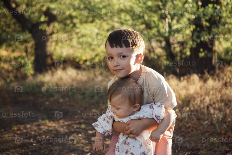 Маленький мальчик радостно носит малыша на спине в солнечном лесу, окруженном зеленью и мягкими тонами земли, захватывая момент братской привязанности и игривости