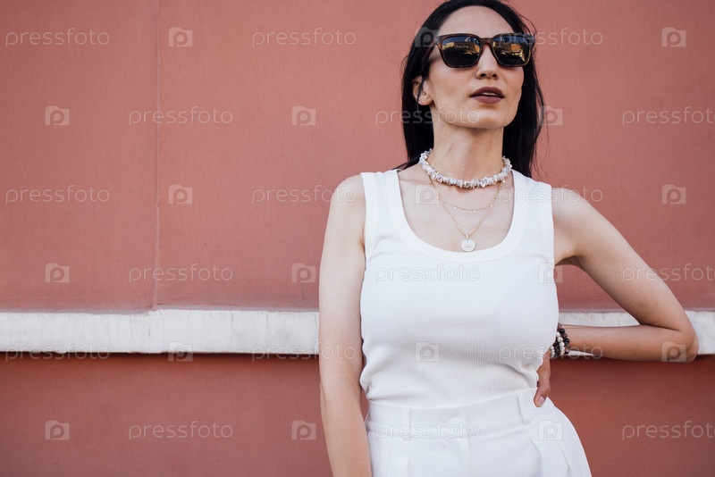 Стильная женщина в солнцезащитных очках и белом топе уверенно позирует на текстурированной розовой стене, демонстрируя современную моду и эстетику городского образа жизни