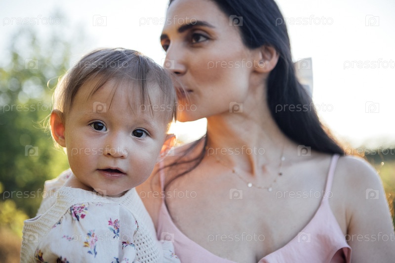 Женщина, держащая малыша на солнечном свете на открытом воздухе, демонстрирует нежный момент связи и любви между матерью и ребенком в естественной среде