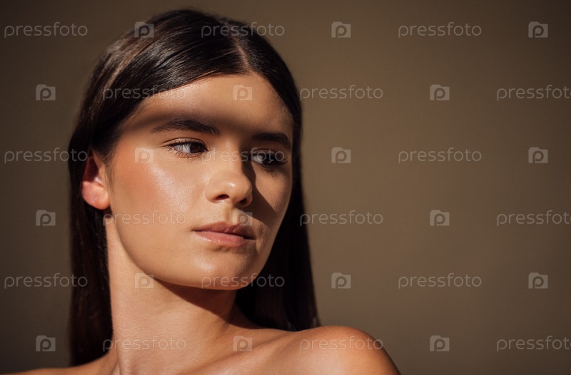 Молодая женщина с длинными темными волосами, мягко освещенная естественным светом, вдумчиво смотрит на тени, создавая яркий контраст на ее лице, воплощая красоту и самоанализ
