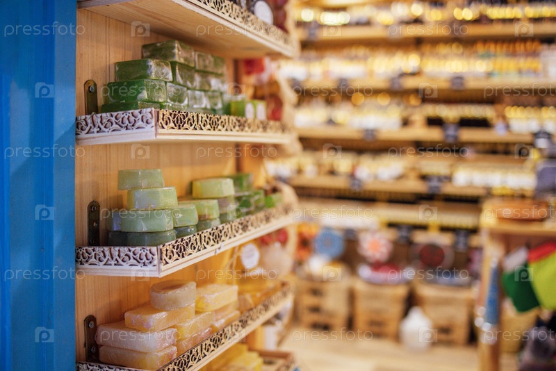 Красочные сапоги ручной работы выставлены на деревянных полках в магазине с различными продуктами и декором, видимым на размытом фоне