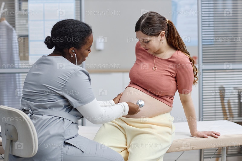 Белая беременная молодая женщина осматривается чернокожей женщиной-врачом в клинике