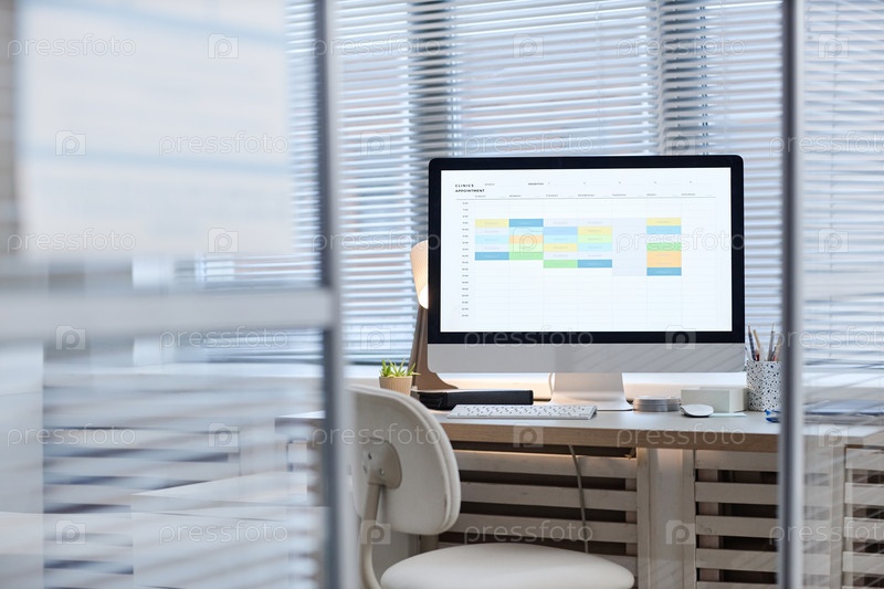 Офисный стол с компьютером Монитор, отображающий современный цифровой календарь