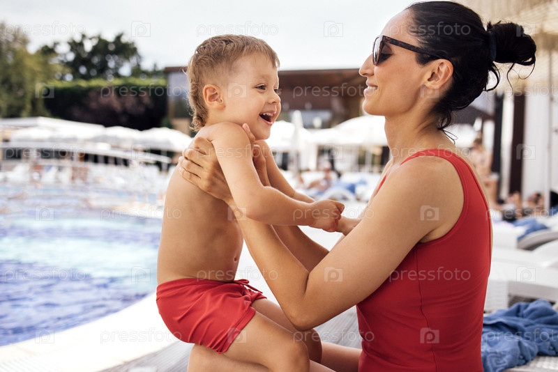 Веселая женщина в красном купальном костюме держит улыбающегося ребенка в красных купальниках у бассейна, наслаждаясь солнечным днем, захватывая суть летнего веселья и семейной связи