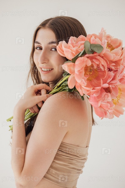 Молодая женщина с длинными волосами держит яркие розовые пионы, мягко улыбается на светлом фоне, воплощая красоту и радость в спокойной атмосфере с цветочными элементами