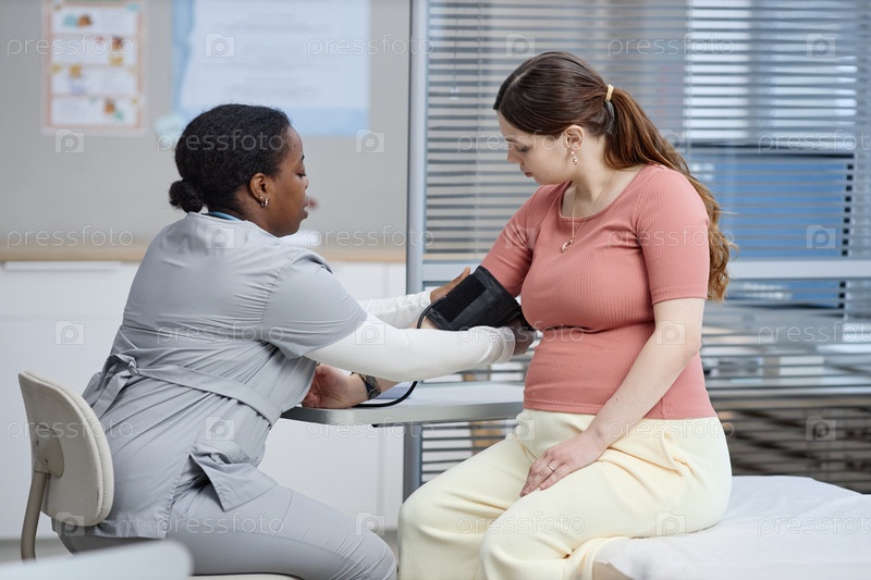 Молодая белая беременная женщина с высоким кровяным давлением проверена чернокожей медсестрой