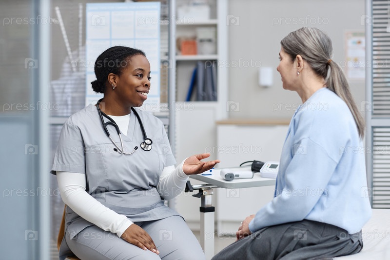 Молодые взрослые чернокожие женщины врачи консультируют пациентов средних лет белых женщин
