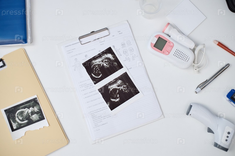 Ультразвуковые снимки, показывающие плод на медицинских документах в клинической обстановке