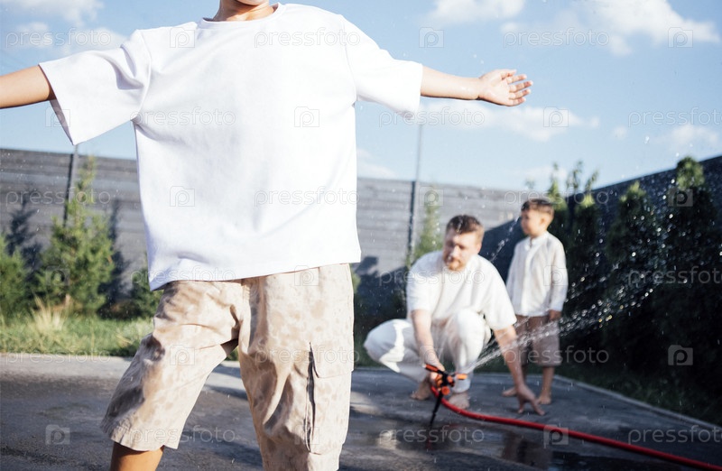 Маленький мальчик радостно играет с водой на солнечном заднем дворе, в то время как мужчина опрыскивает воду и другой ребенок смотрит, захватывая веселый летний момент семейного единства