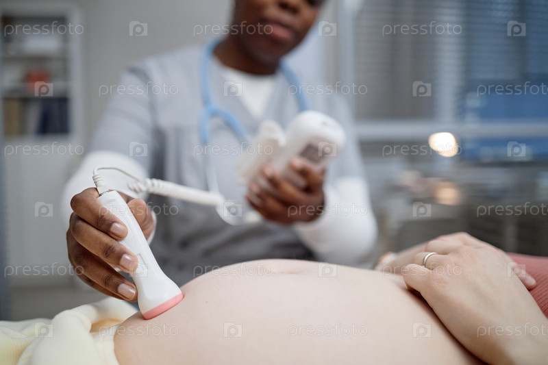 Чернокожая женщина-врач, выполняющая ультразвуковое исследование беременной женщины