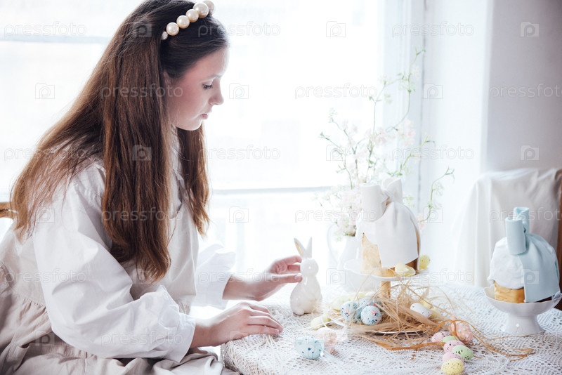 Молодая женщина сидит за столом, украшенным пасхальным декором.Элегантная девушка в жемчужной головной повязке держит фигуру пасхального кролика и торты