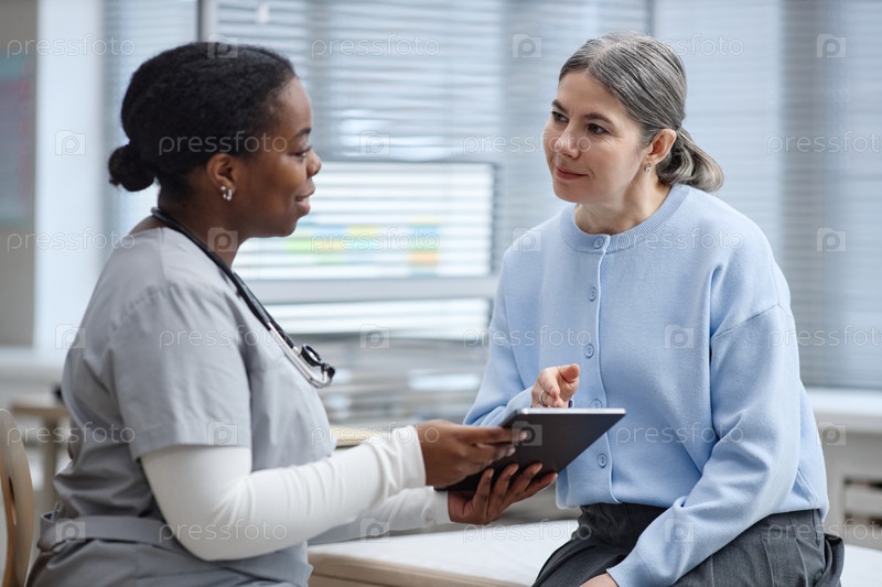 Кавказская женщина среднего возраста слушает взрослого чернокожего медицинского работника