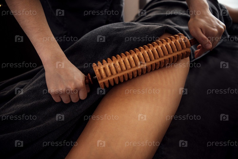 Массажист использует деревянный ролик на бедро клиента, демонстрируя терапевтическую технику в спокойной спа-среде с мягким освещением и успокаивающей атмосферой