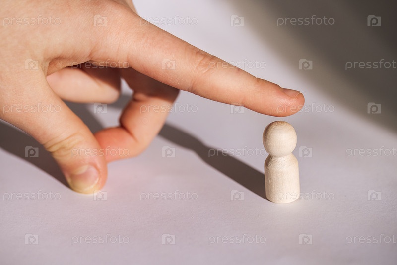 Рука ребенка нежно касается небольшой деревянной статуэтки на белой поверхности, создавая игривое взаимодействие между двумя объектами в минималистической обстановке