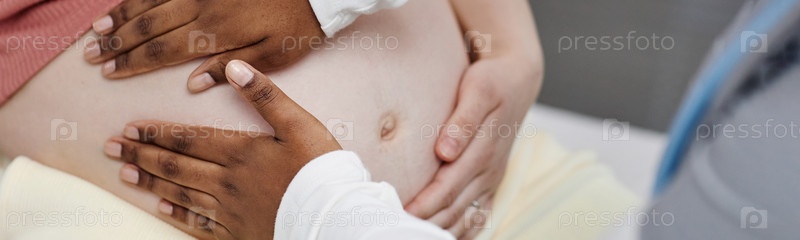 Глава белокожей беременной женщины, осмотренная чернокожей медицинской специалисткой