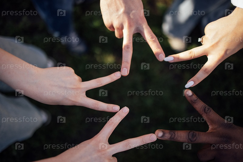 Разнообразная группа рук, формирующая звездочку с помощью пальцев, демонстрирует единство и сотрудничество на травяной наружной поверхности в естественной обстановке