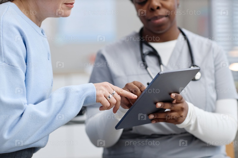 Зрелая кавказская женщина просматривает медицинскую информацию с чернокожей медсестрой