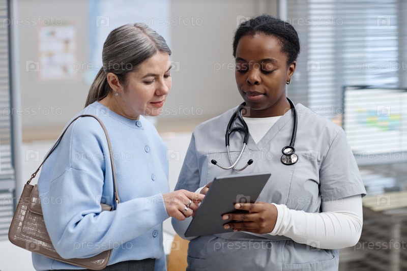 Белая женщина средних лет обсуждает варианты лечения с чернокожей медсестрой