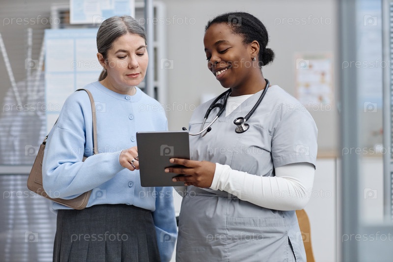 Кавказская женщина средних лет получает медицинское руководство от чернокожей медсестры