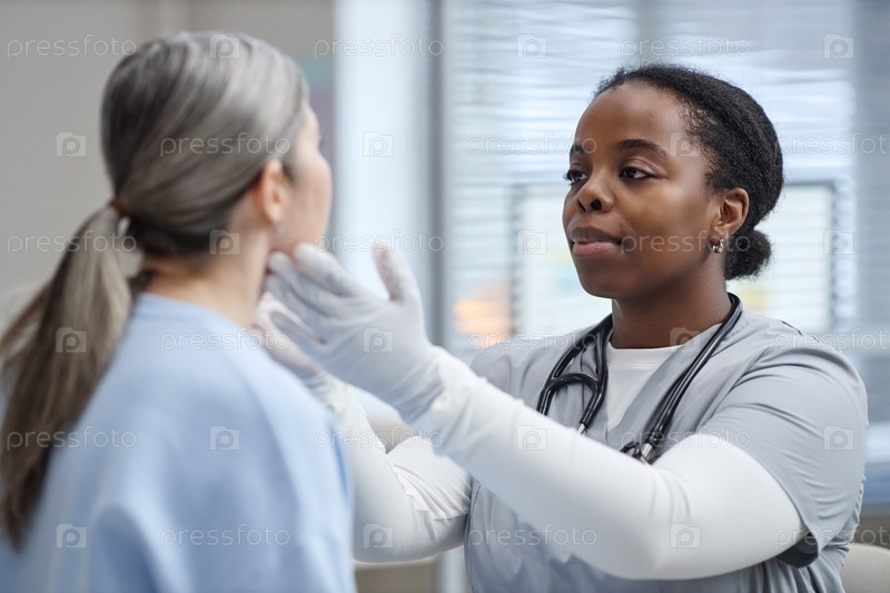 Молодая взрослая чернокожая женщина Врач, осматривающий пациента-белую женщину среднего возраста