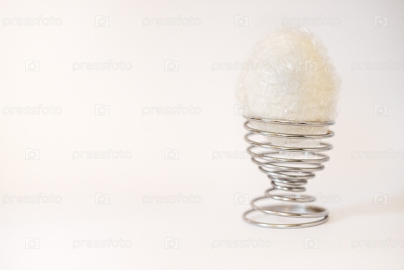 Белый яйцевидный объект, опирающийся на металлический спиральный держатель для яиц на простом светлом фоне, демонстрирует минималистский дизайн и современную эстетику