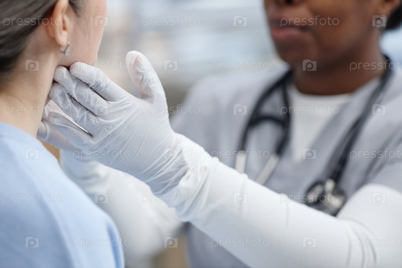 Чернокожая женщина среднего возраста Врач, осматривающий молодого взрослого белокожей женщины шею