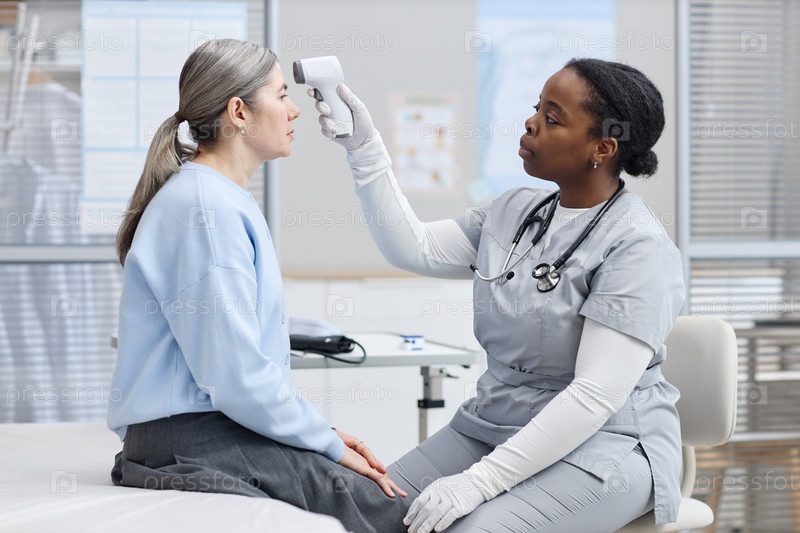 Кавказская женщина средних лет получает проверку температуры от черной медсестры