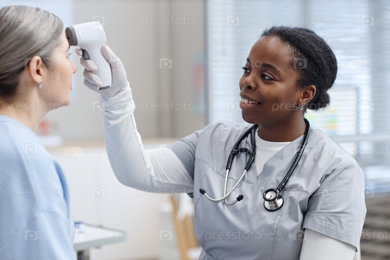 Молодая взрослая чернокожая женщина медсестра, измеряющая температуру среднего возраста белой женщины