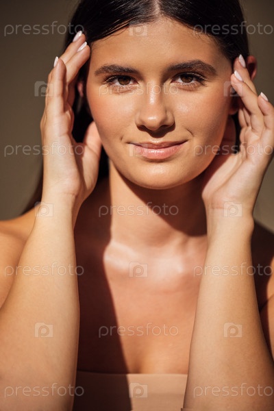 Молодая женщина с длинными темными волосами нежно касается ее лица, демонстрируя естественную красоту и сияющую кожу, освещенную мягким теплым светом в спокойной атмосфере
