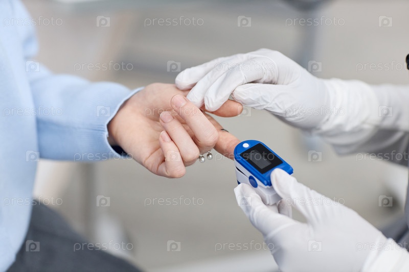 Кавказская молодая взрослая женщина, имеющая уровень кислорода, измеренный с помощью пульсоксиметра