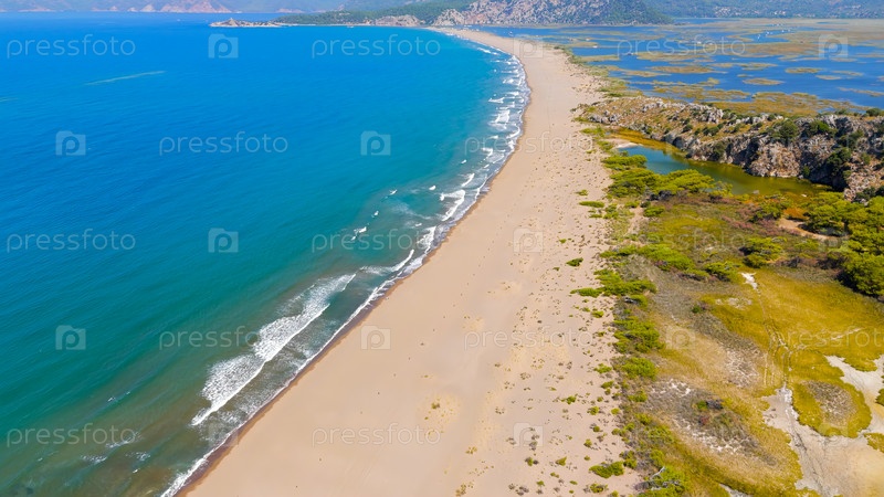 Панорамное видео с беспилотного летательного аппарата о побережье пляжа Изтузу, устье реки Далян и горах, идеально подходит для путешествий и летних каникул в Турции