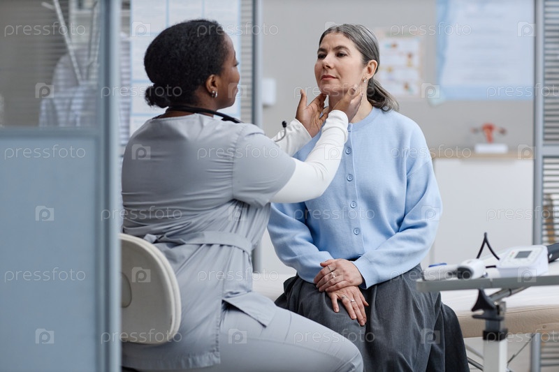 Кавказская женщина среднего возраста получает медицинский осмотр от чернокожего врача