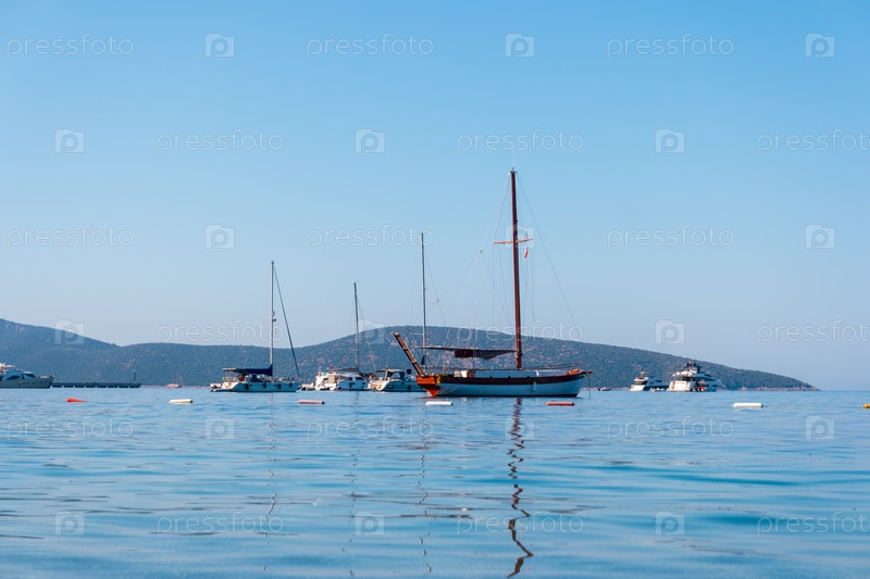 Яхты, брошенные на якорь в бухте с отдаленной береговой линией, видимой через утренний туман, спокойное Эгейское море, вид под низким углом близко к уровню воды