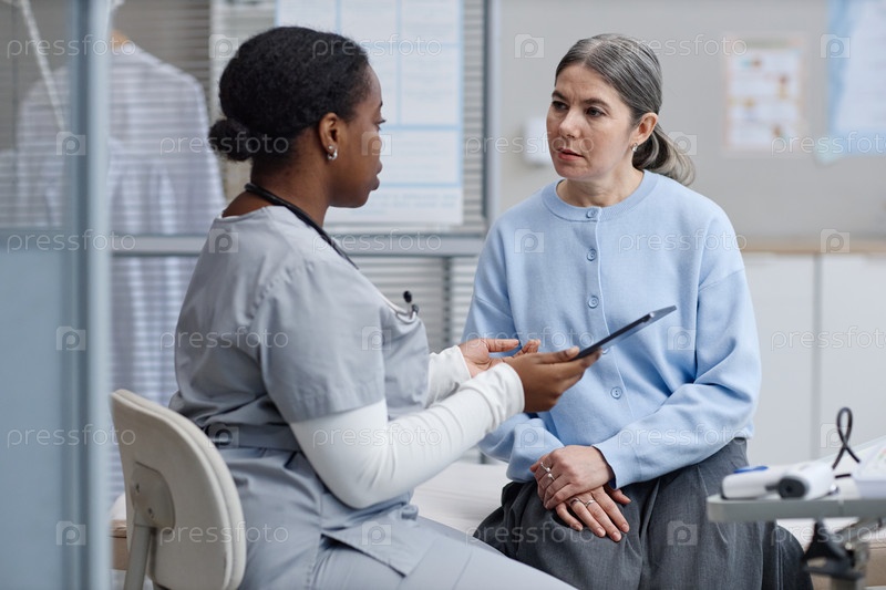 Белая женщина среднего возраста слушает чернокожую медсестру, объясняющую диагноз