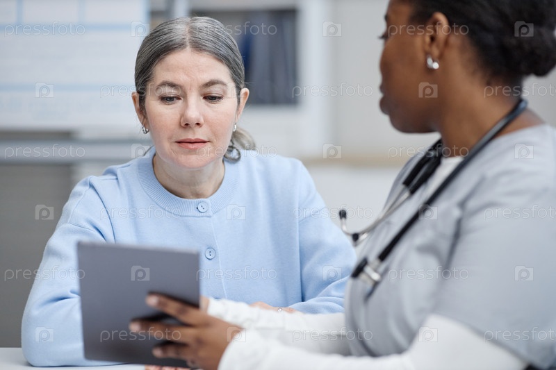 Кавказская женщина среднего возраста получает медицинскую консультацию от черной медсестры