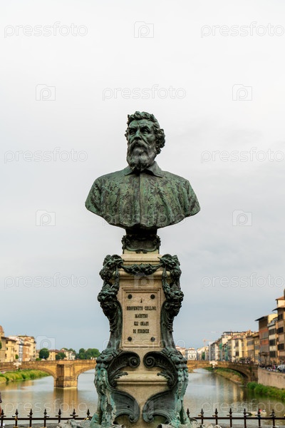 Флоренция, Италия. памятник фонтану Cellini на Старом мосту. открыт в 1902 году скульптором Рафаэлло Романелли (1856-1928). надпись на пьедестале: Benvenuto Cellini. учитель. ювелиры Флоренции