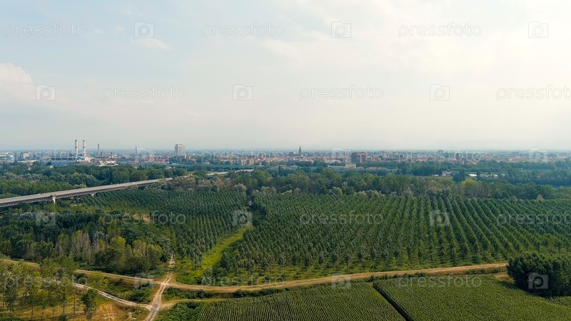 Пьяченца, Италия.Полет в сторону города над полями.Река По, Aerial View