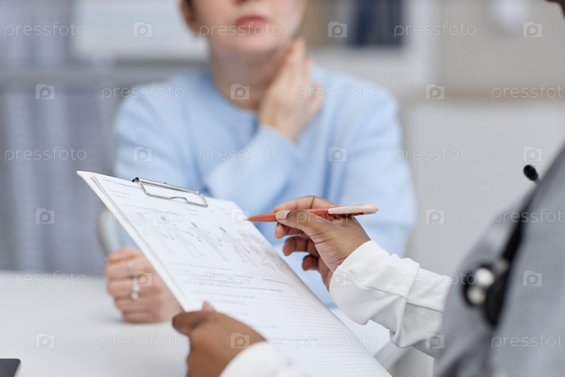 Чернокожая женщина-врач, пишущая в диаграмме пациентов во время консультации в клинике