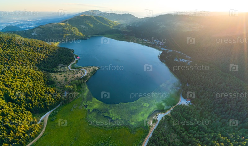 Абант - большое пресноводное озеро, окруженное горами и лесом с живописным видом. время захода солнца. летний пейзаж. вид из воздуха