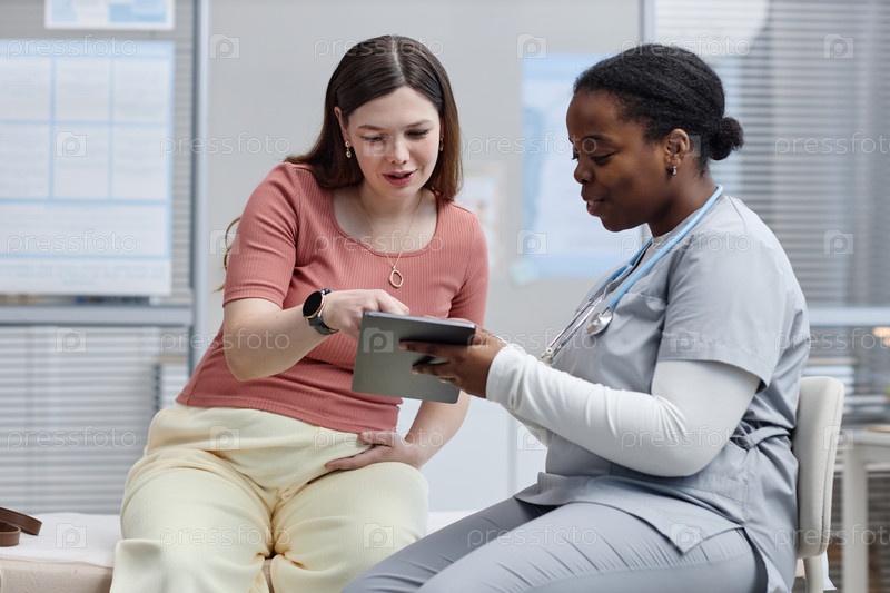 Молодая кавказская женщина консультирует чернокожую медсестру с помощью цифрового планшета