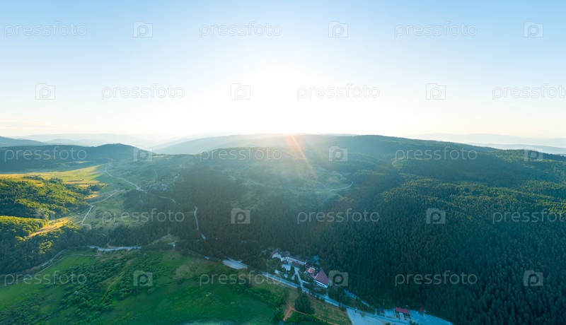 Болу, Турция. Парк озера Абант. Окружающие горы, покрытые лесом. Время захода солнца. Летний пейзаж. Вид с воздуха
