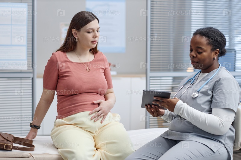 Беременная молодая кавказская женщина консультируется с чернокожей женщиной врачом, использующим планшет