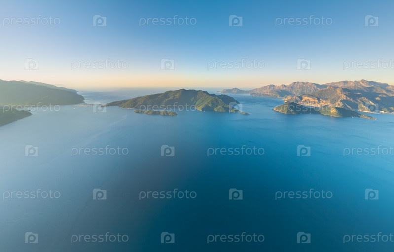 Панорамный взгляд с воздуха на пустую бухту без яхт, острова Сеннет и Кечи со Средиземным морем на горизонте