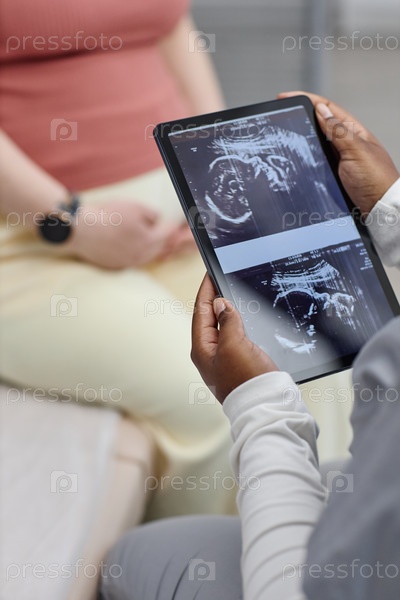 Вертикаль врача, рассматривающего ультразвуковое изображение беременной белокожей женщины